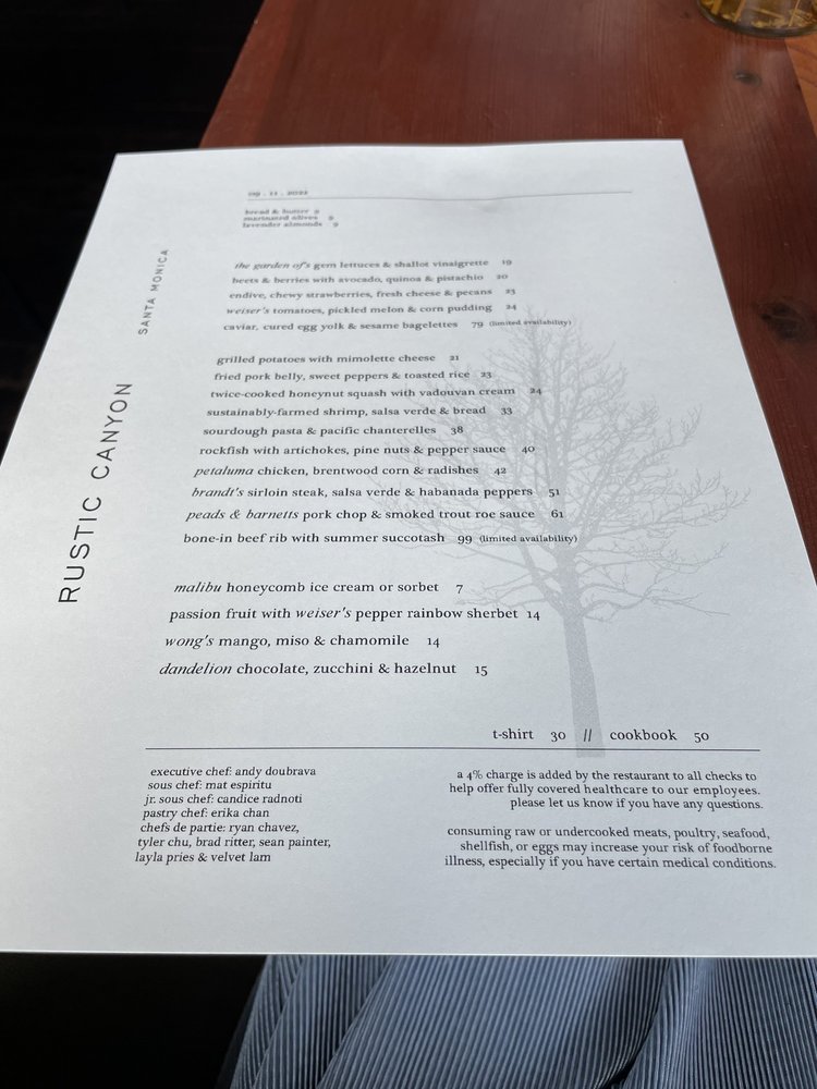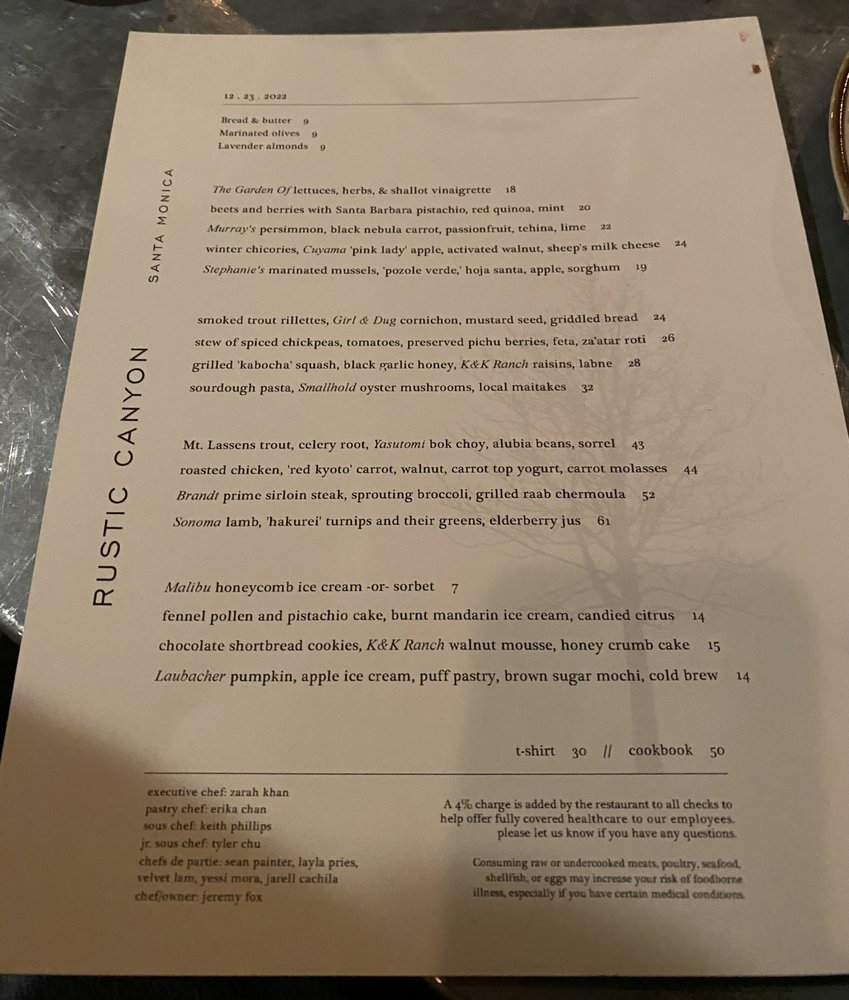Introducing Rustic Canyon, a New American restaurant in Santa Monica offering a diverse menu with Pescatarian, Vegan, and Vegetarian options. The establishment is women-owned, with a trendy and casual atmosphere. The menu is seasonal, ensuring fresh and innovative dishes. Customers rave about the outstanding service, original flavor profiles, and romantic ambiance. Highlights include the cheese gnocchi, pear dish, persimmon dish, beef tartar, and the highly acclaimed birria. The cocktails, like the Jay dogs nog and unique Goth sunshine mocktail, are also top-notch. The house-made honey comb ice cream is a must-try. Overall, Rustic Canyon provides a top-tier farm-to-table dining experience, with a personal touch in their relationships with farmers, ensuring top quality ingredients in every dish. Enjoy a memorable dining experience at Rustic Canyon.
